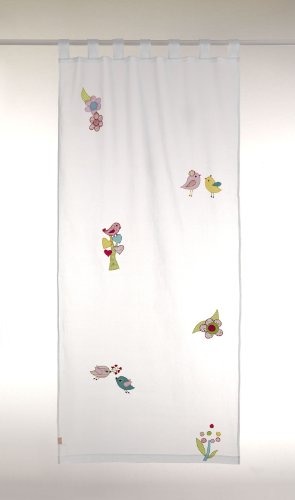 Der weisse Schlaufenvorhang 'Birds' ist mit bunten Vögelchen & Blumenmotiven wunderschön verziert.....
