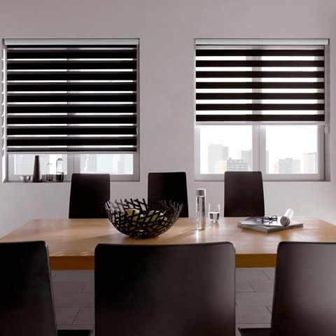 100% Polyester, feucht abwischbar, blickdicht, halbtransparent Größe: 140cm breit x 160cm lang Doppelrollo mit Blende und Unterprofil in silber Farbe: schwarz Kettenzug rechts,individuell regulierbares Raumlicht