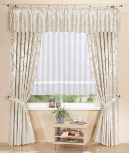Gardinen Set, 1 x Damast Gardinen Set, Vorhang und Querbehang, Creme, 1 x Kurzstore Gardine mit Taftborte, 140x300, Weiß,