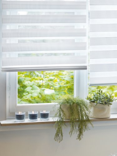 Farbe: grau Doppelrollo mit Blende und Unterprofil in silber Größe: 120cm breit x 160cm lang ( Stoffmaß 2cm weniger) 100% Polyester, feucht abwischbar, blickdicht, halbtransparent Kettenzug rechts,individuell regulierbares Raumlicht