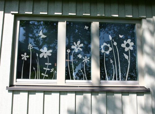 Fenstertattoo - Motiv "Blümchenwiese" aus Milchglasfolie in Farbton TRANSPARENT mit Silberglitzer Feature