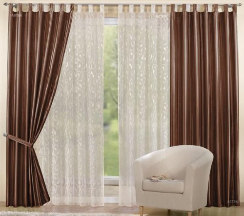 Gardinen Set, 2 x Gestreifter Deko Taft Vorhang, 245x140, Braun, 2 x Schlaufenschal Voile Sherli, 245x140, Creme, 0393061111 Feature