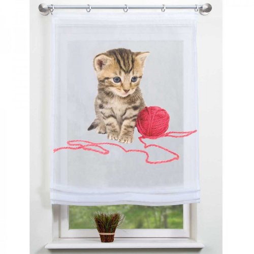Raffrollo aus transparentem Voile, digital bedruckt Höhenverstellbar durch Stoppertechnik, inkl. komplettem Zubehör zur leichten Montage Mit "Katzen"-Motiv digital bedruckt, 100% Polyester Einfach Aufhängen und Fertig! Aufhängung mittels beigelegtem Flausch- und Klettband, inkl. Trägerschiene mit Tellergleitern