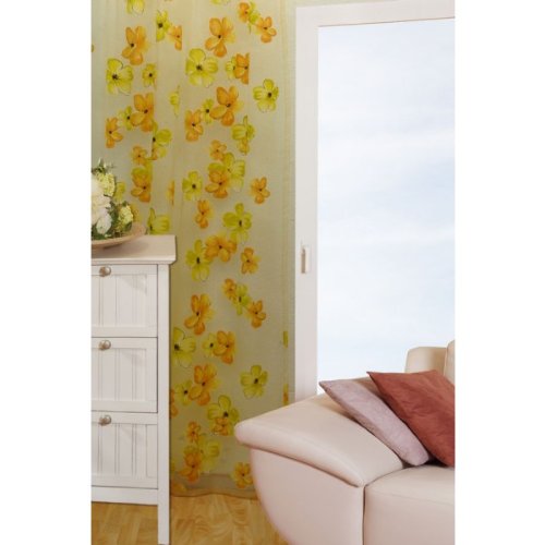 Moderner, sanft fallender, transparenter Schlaufenschal / Gardine in zartgrün mit dekorativen großen Blüten in orange-grün - Feature