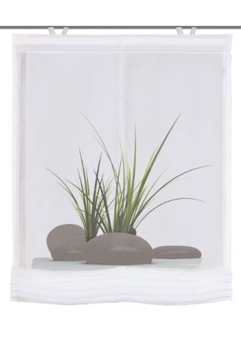 Aufhängung mittels beigelegten easyFIX-Fensterhaken, passend für alle gängigen Fenster, bis zu 2 cm Fensterstärke, inkl. Filzklebepunkte zum Schutz der Fenster - AUFHÄNGEN OHNE BOHREN! Raffrollo aus transparentem Voile MIT FENSTERHAKEN, Aufhängen ohne Bohren! Höhenverstellbar durch Stoppertechnik, inkl. komplettem Zubehör zur leichten Montage mit "Steine-Gräser-Motiv" - digital bedruckt, 100% Polyester